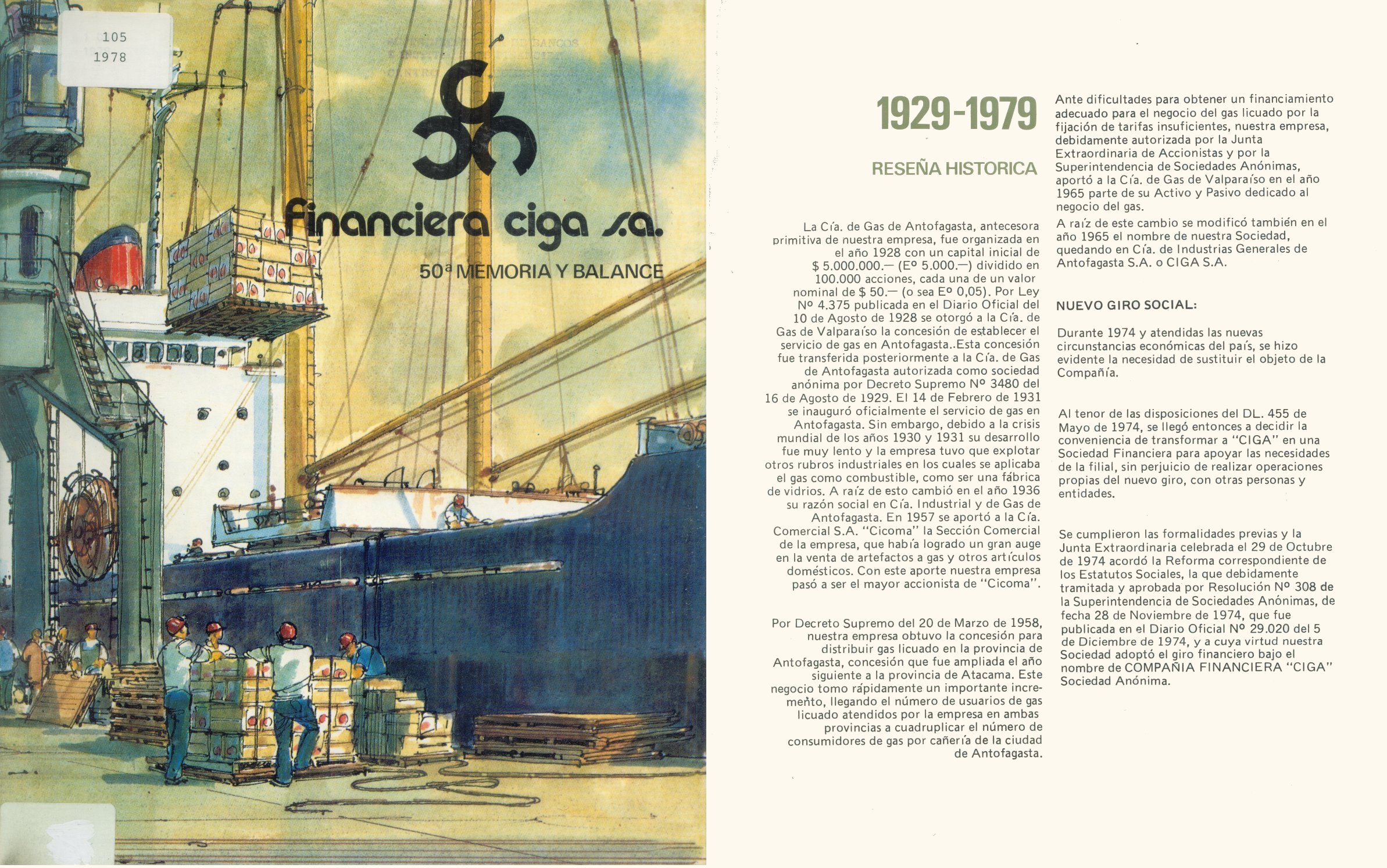 "Ante dificultades para obtener un financiamiento adecuado para el negocio del gas licuado por la fijación de tarifas insuficientes, nuestra empresa, debidamente autorizada por la Junta Extrordinaria de Accionistas y por la Superintedencia de Sociedades Anónimas, aportó a la Cía. de Gas de Valparaíso en el año 1965 parte de su Activo y Pasivo dedicado al negocios del gas. A raíz de este cambio se modificó también en el año 1965 el nombre de nuestra Sociedad, quedando en Cía. de Industrias Generales de Antofagasta S.A. o CIGA S.A." Financiera Giga S.A. 50ª. Memoria y Balance.